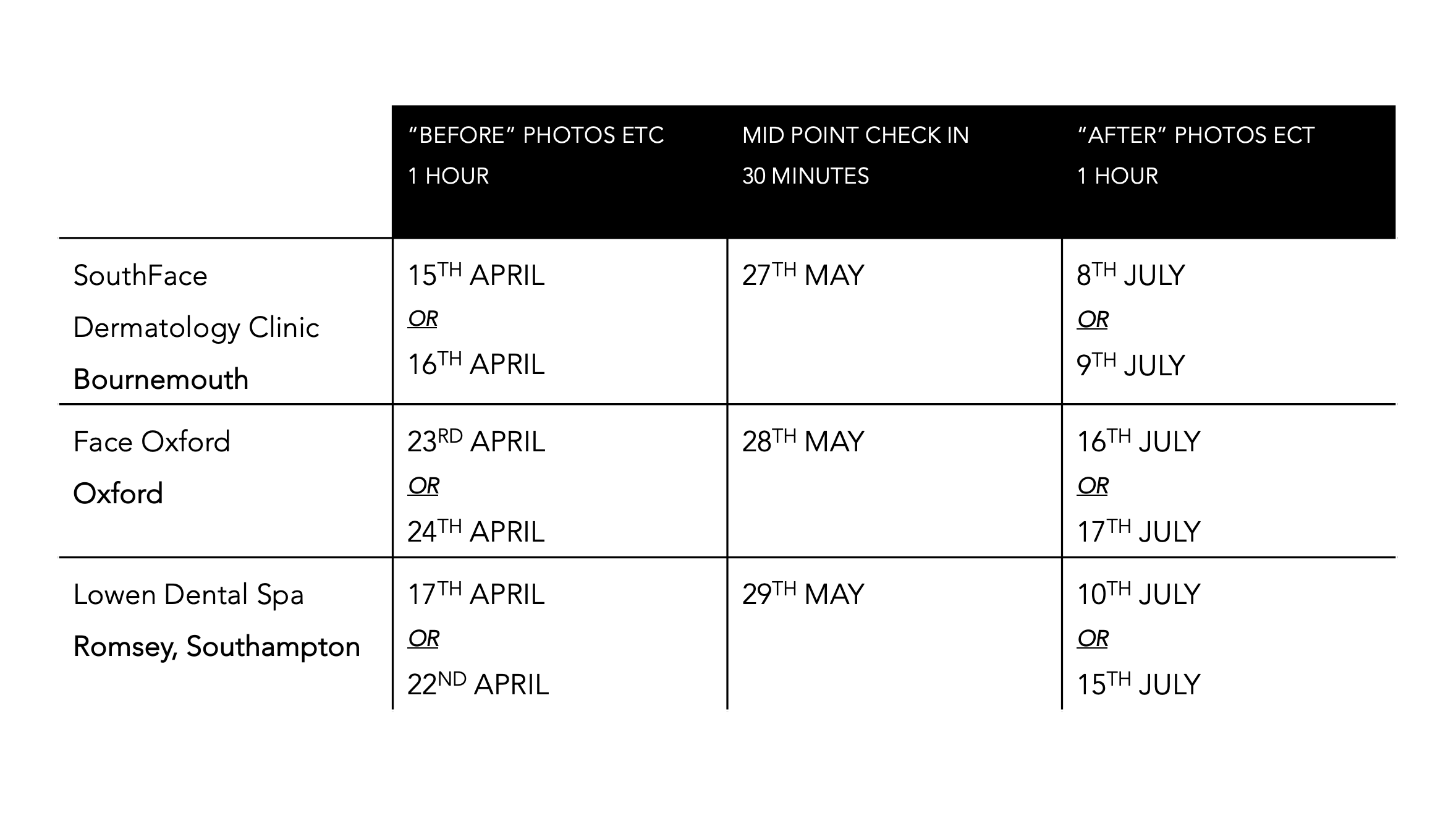 You must be available for all three sessions at weeks 0, 6 and 12. The clinic date by location are below.